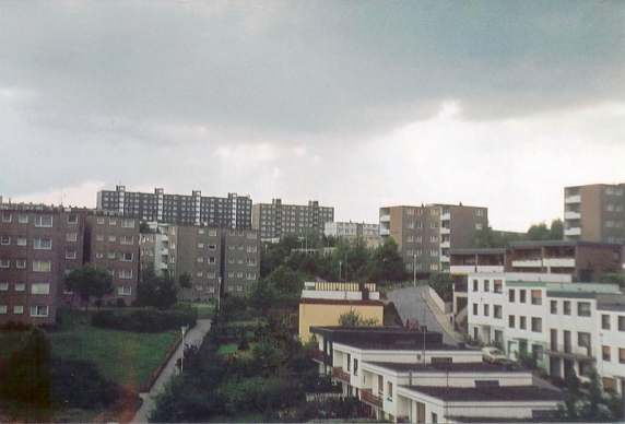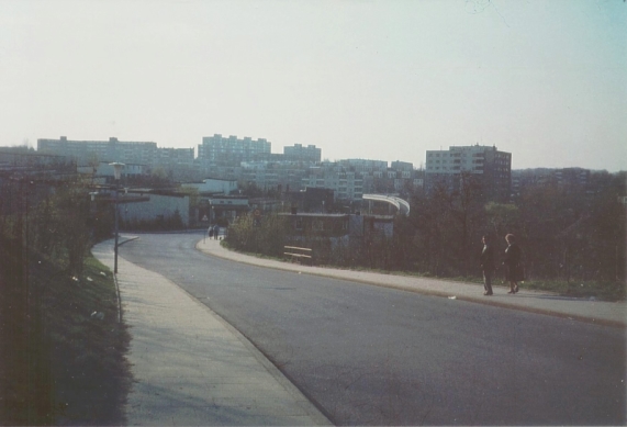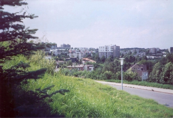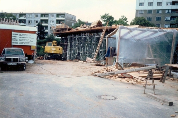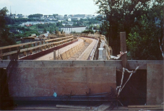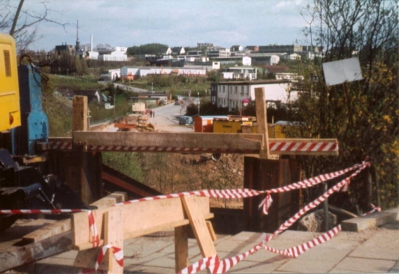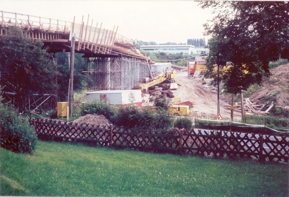 Baustelle der Fußgängerbrücke, Blick zu den Häusern Moselstr. 38 – 42